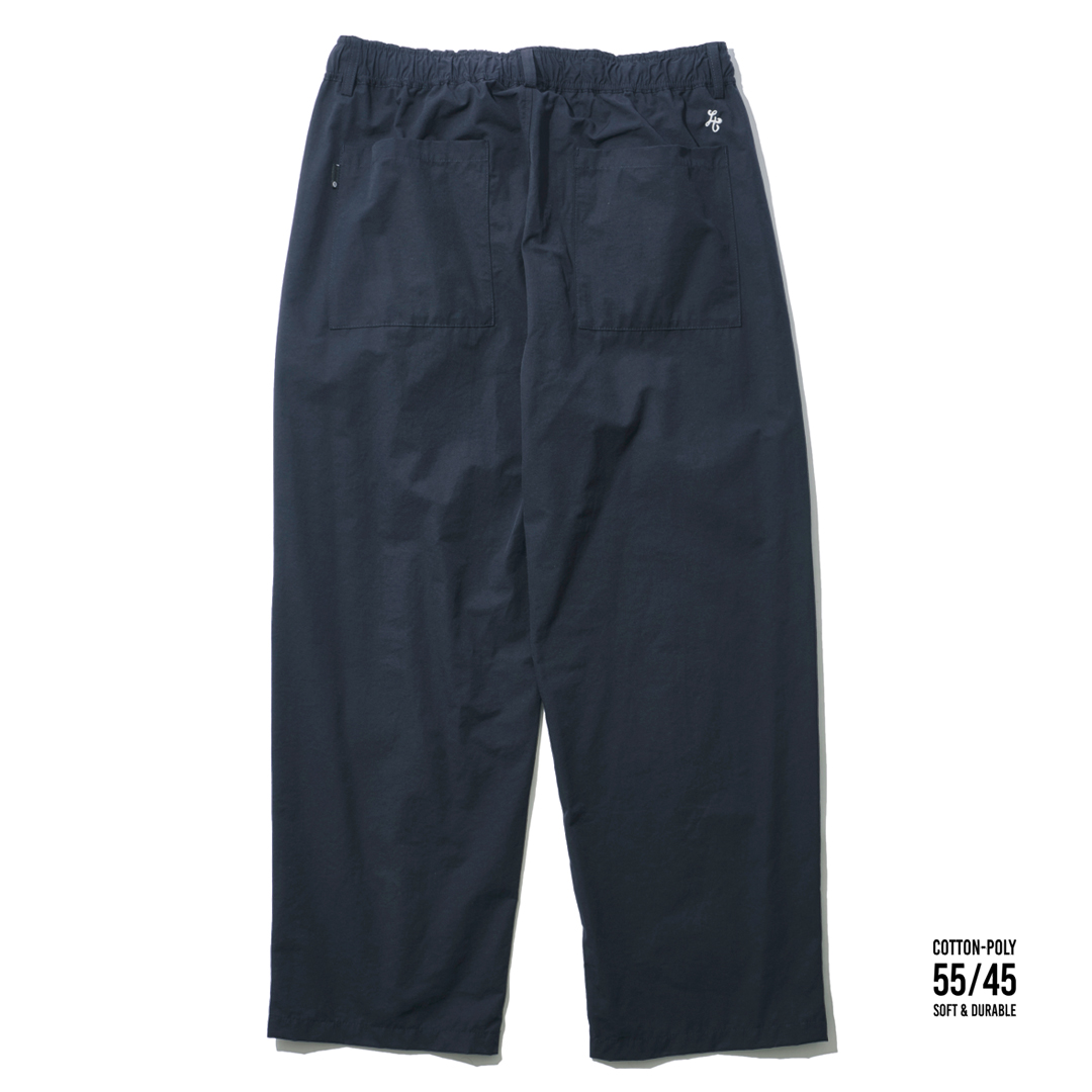 やや大きめのPatch Poket(バック)、物が溢れないやや深めのVertical Poket(サイド)、ピスネームとエンブレム刺繍のみのシンプルなデザイン。 ウエストゴム+紐と一般的なEASY PANTSのスタイルにベルトループ有りと2way仕様の一本。 肝心のSizeは【ONE FITS ALL(168〜175cm推奨)】、ロールアップ(低身長)、クロップド丈(高身長)でもシルエットの崩れない形はパタンナーの業。 クルージングに突っ張る事ないやや太めのシルエットはそのままに、新たな55% Cotton / 45% Polyモデルは、シワを気にせず速乾性とタフで型崩れに強いがCottonの快適さも備え、より軽く、旅行(出張)の際に迷った時の1本として。 もちろんトランクに入れて置けるよう共生地の巾着袋も標準装備。 翌日の着替えに、ホテルでのリラックス時に、咄嗟の替えに、無論デイリーユースにもこれで凡ゆるシーンに対応できる。 ”備えあれば憂いなし”、It’s not just a bag. It’s a Lifestyle.